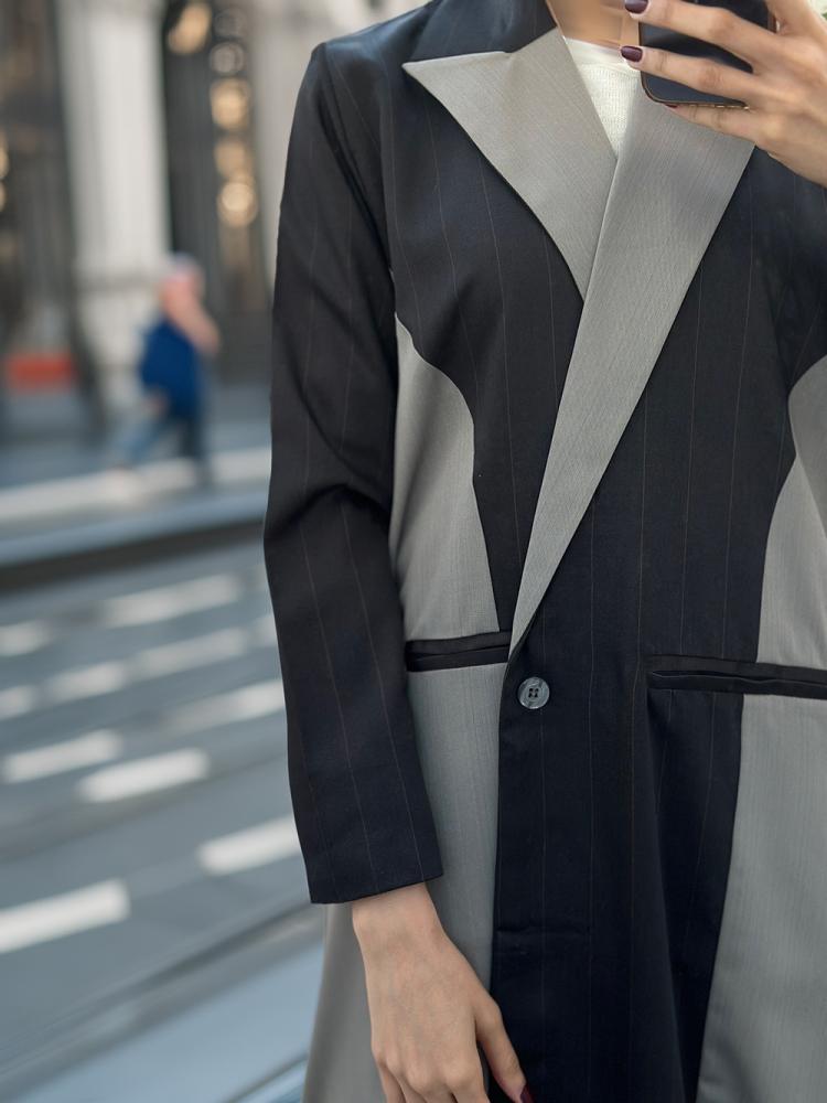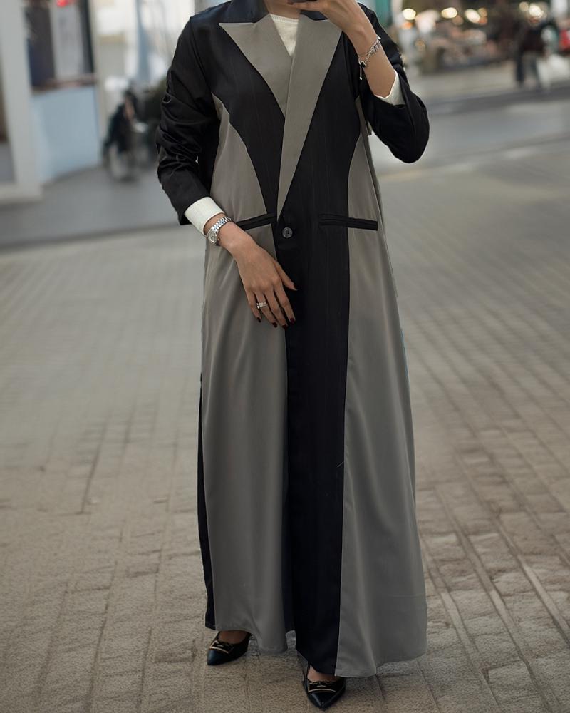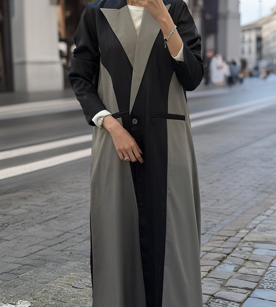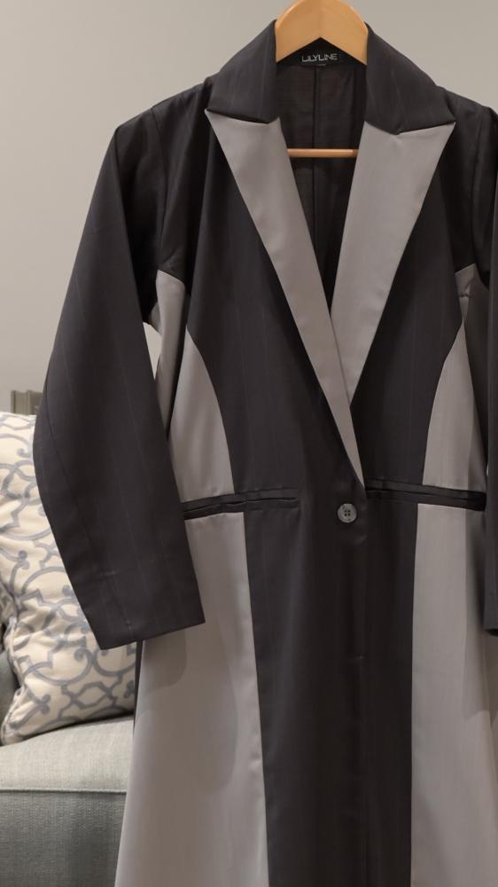 عباية عملية بياقة بليزر وجيوب وهمية ، بلون بني غامق مع تقليمة خفيفة و قماش بيج فاتح ،قصة حرف A , مرفقة طرحة بلون مناسب (بني )