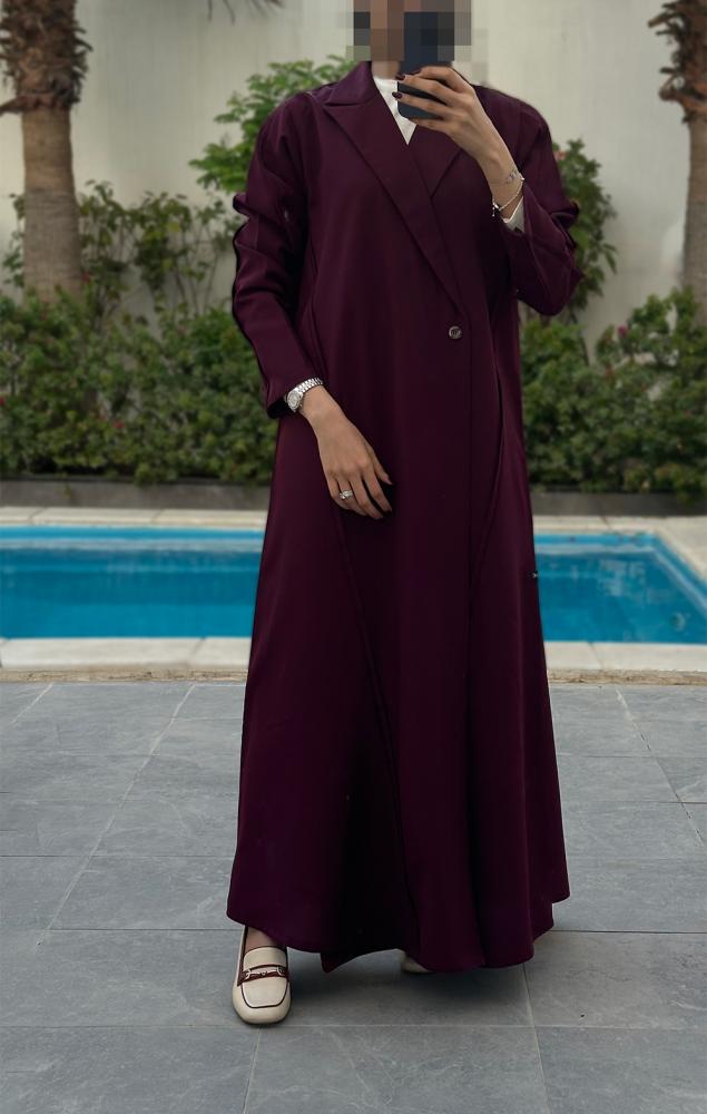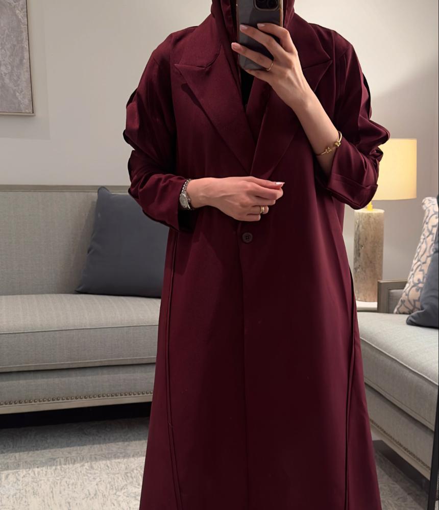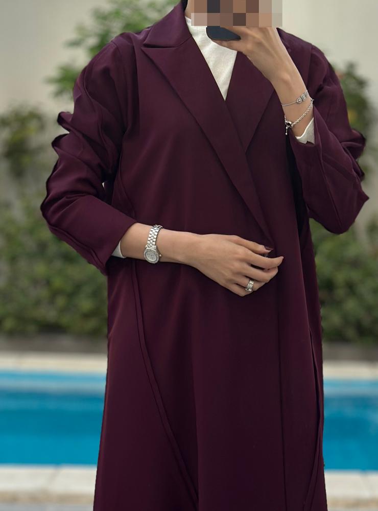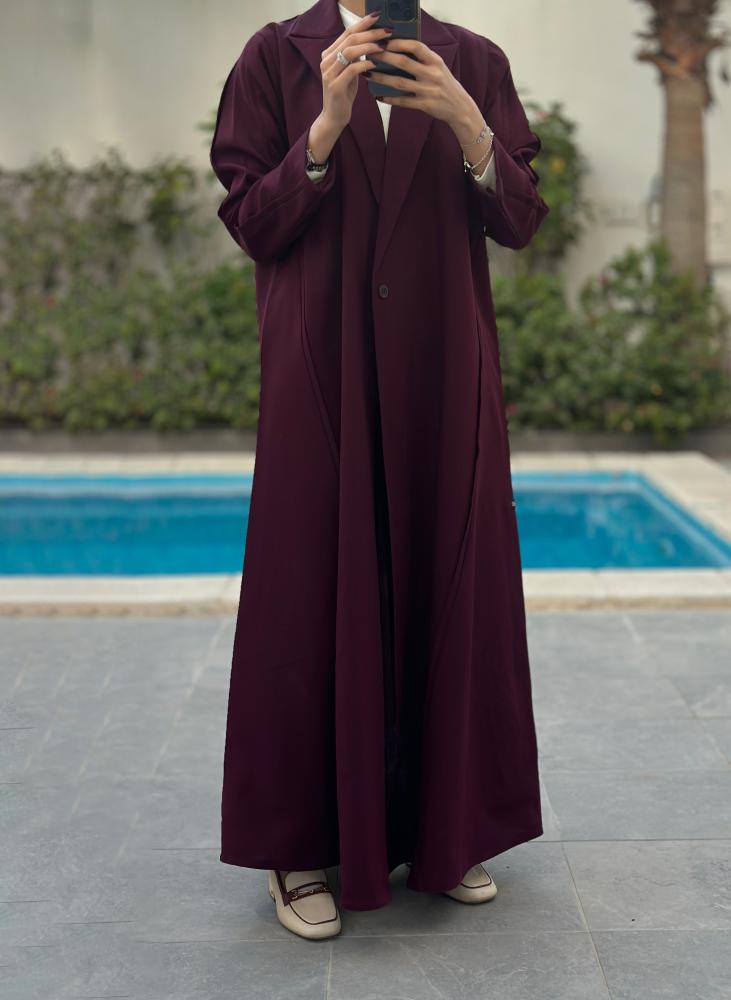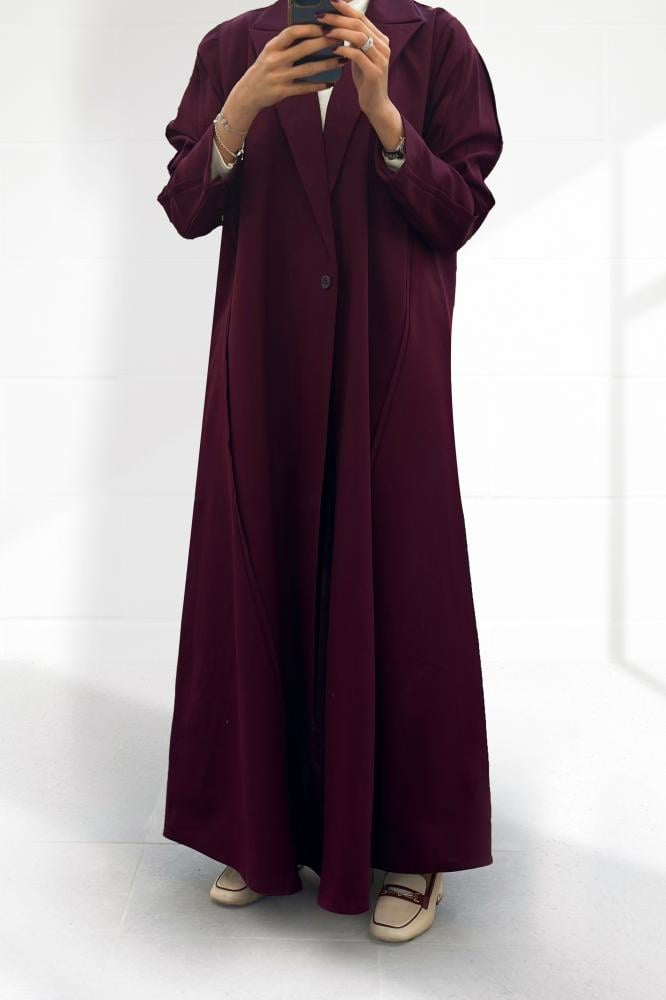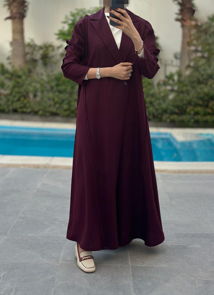 عباية عملية بياقة بليزر ، بلون عنابي ، نص كلوش , مرفقة طرحة بنفس لون العباية