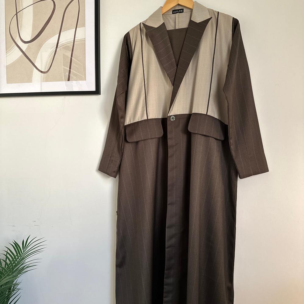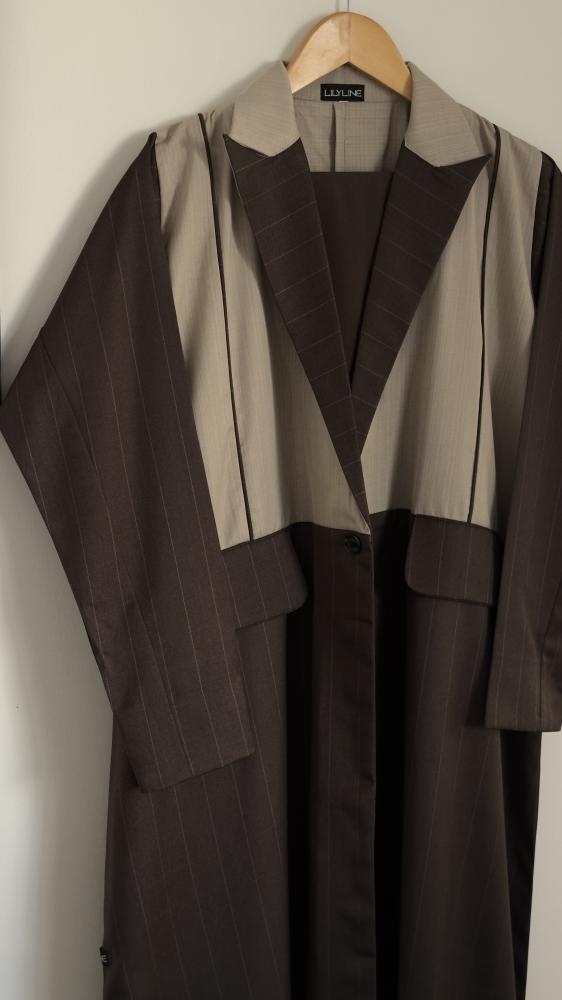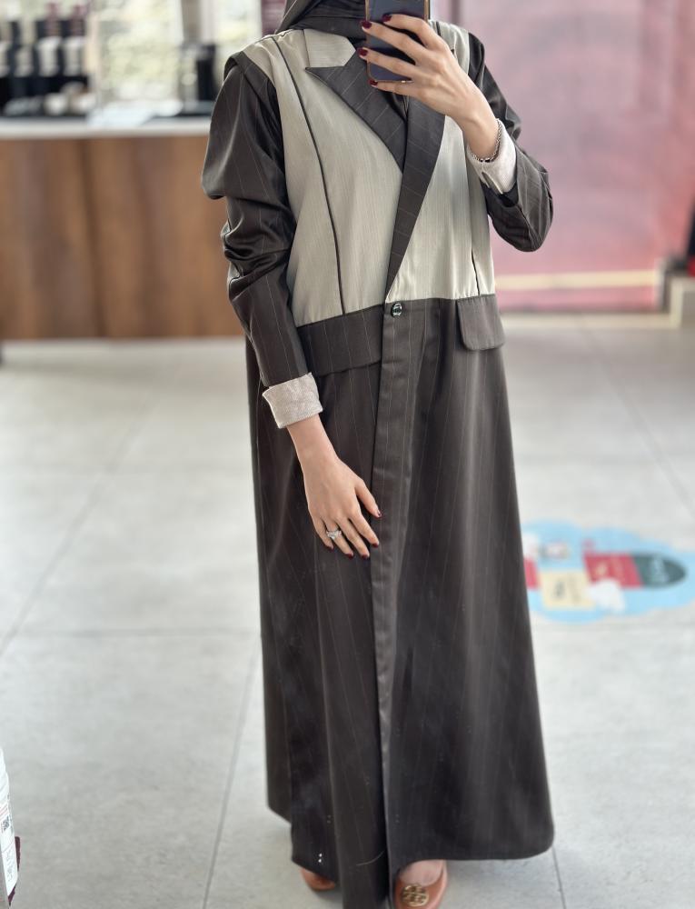 عباية عملية بياقة بليزر ، بلونين بني وبيج ،قصة حرف A , مرفقة طرحة بلون مناسب
